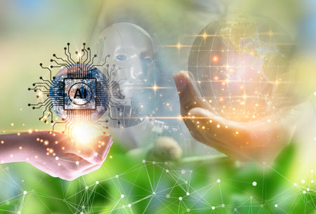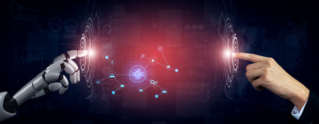 A captivating visual of a human hand reaching out to a robotic arm, incorporating a digital power symbol, emphasizing the innovation and evolution of technology.