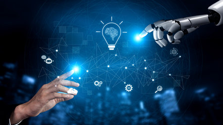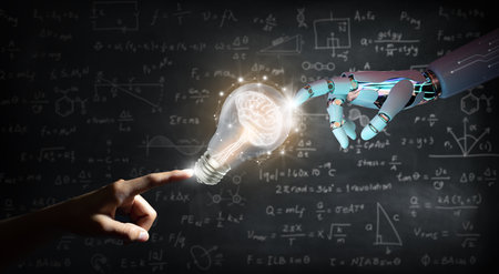 futuristic hand robot pointing lightbulb, representing concepts of artificial intelligence, AI, robotics, machine learning and education innovation.digital technology analysis.
