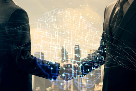 Double exposure of brain hologram and handshake of two men. Partnership in IT industry concept.