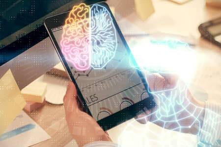 Double exposure of brain sketch hologram and woman holding and using a mobile device.