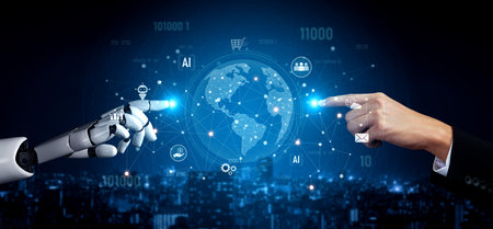 robotic hand touching technology digital icon on business background. AI and internet have made doing business today more convenient you can work anywhere without limitations