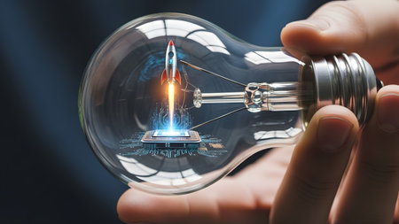 Glass showing hand holding a light bulb with a rocket and microchip inside representing...