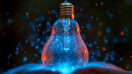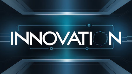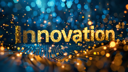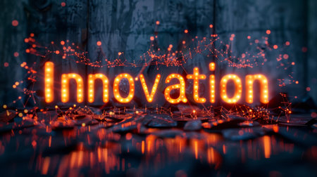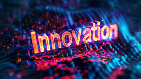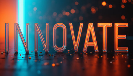 The word INNOVATE glows in striking neon hues of orange and blue, set against a dark, sparkling background. This captivating image embodies creativity and forward-thinking, inviting viewers to embrace new ideas and possibilities.