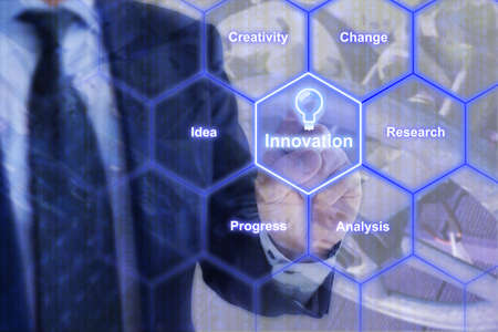 Businessman holding icon with Innovation words on the screen. business concept.