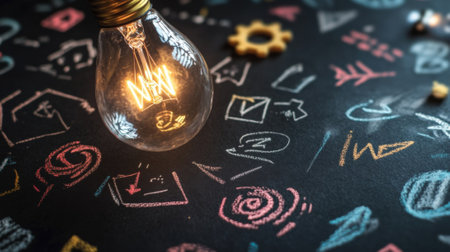A lightbulb surrounded by a spiral of colorful chalklike drawings depicting various symbols of innovation such as gears arrows and abstract shapes. The bulb itself is partially illuminate