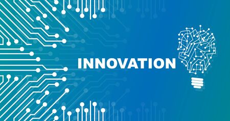 Word INNOVATION on blue background with light bulb and circuit board lines, vector illustration. Panorama