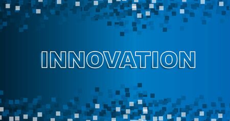 Vector illustration with word INNOVATION on blue background with geometric shapes, panorama