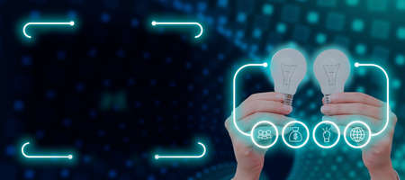 Businesswoman Holding Electric Bulbs With A Digital Display Of Symbols In Futuristic Frame Presenting New Ideas. Woman With Lights In Hands Showing Important Information.