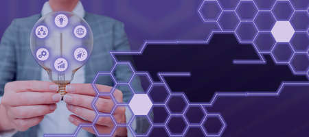Businesswoman Holding With Two Hands A Light Bulb Image With Digital S Inside In A Hexagon Pattern. Woman Displaying Creative Ideas And Important Concepts.