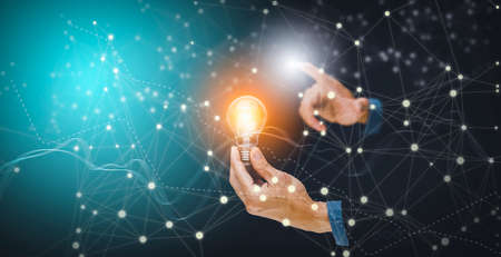 The Man hand holding light bulb with line connect and working on the desk, Creativity and innovation are keys to success.Concept of new idea and innovation with energy and power , working at home,