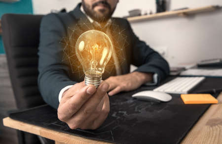 man hand light bulb on working desk