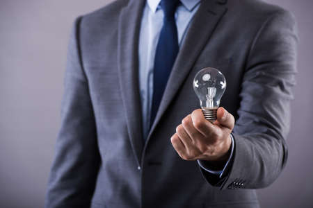 Mid section of businessman holding light bulb against grey background. business idea and professionalism concept