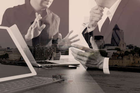 co working team meeting concept,businessman using smart phone and digital tablet and laptop computer in modern office with London city exposure