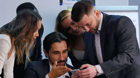 Smiling business team working with smartphone, watching somethng interesting in office