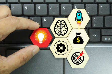 Businessman hand holding light bulb with Business icon on wood cube and working on desk, Creativity, and innovation are keys to success. Concept of new idea and innovation with Brain and light bulbs.