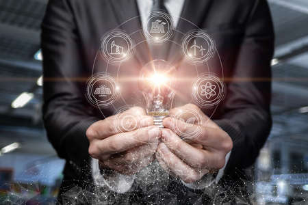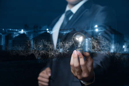 The Man hand holding light bulb with line connect and working on the desk, Creativity and innovation are keys to success.Concept of new idea and innovation with energy and power , working at home,