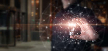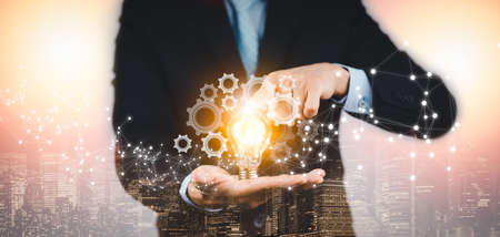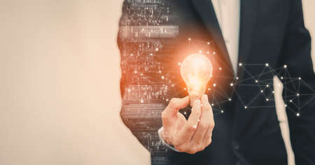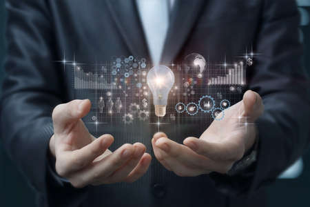 Businessman holding hand light bulb with network connection Innovative technology. Inspiration, brainstorming creative ideas for new innovations. Business technology creativity idea concept.