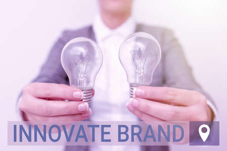 Inspiration showing sign Innovate Brand. Word for significant to innovate products, services and more Lady in business outfit holding two lamps presenting new technology ideas