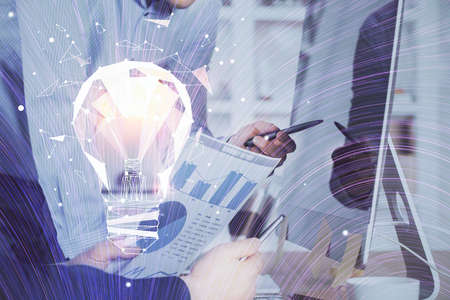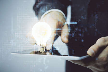 Double exposure of man's hands holding and using a digital device and bulb hologram drawing. Idea concept.
