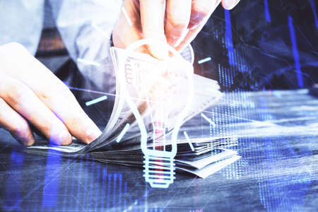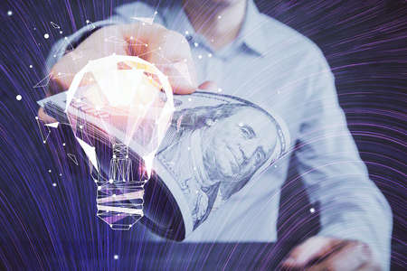 Multi exposure of bulb drawing hologram and USA dollars bills and man hands. Business Idea concept.