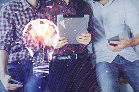 Double exposure of bulb hologram and man and woman working together holding and using a mobile device. Idea concept