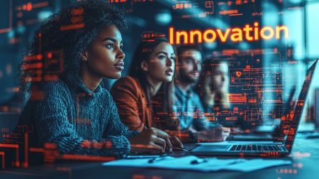 Focused business professionals working on innovation in a tech-driven office