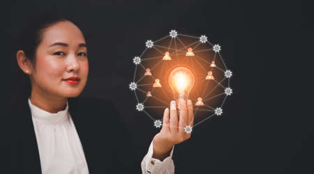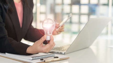 Woman hand holding light bulb with line connect and working on the desk, Creativity and innovation are keys to success.Concept of new idea and innovation with energy and power , working at home,