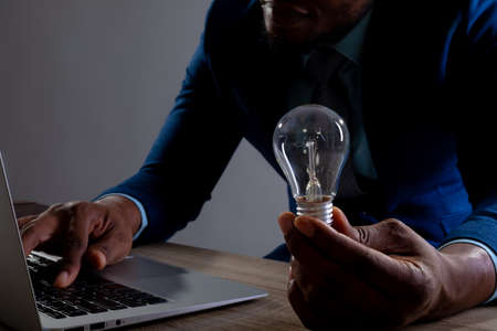 Mid section of businessman holding light bulb using laptop on wooden surface against grey background. business, professionalism and technology concept