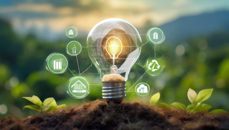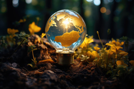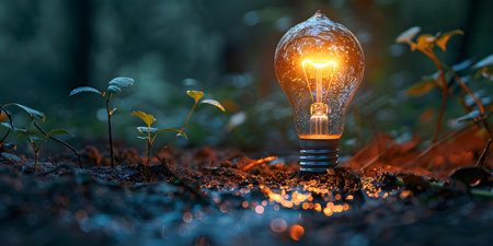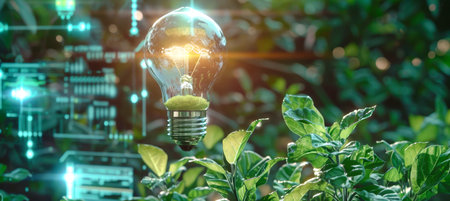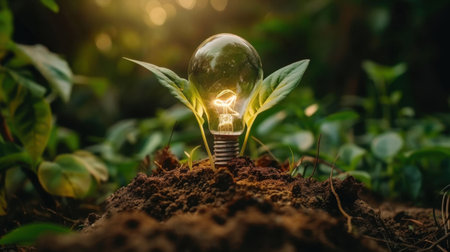Light bulb surrounded by green leaves emerges from soil, symbolizing fusion of nature and technology. This evokes sense of innovation and environmental consciousness