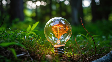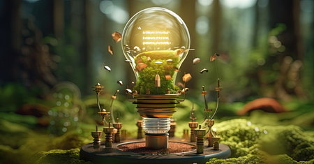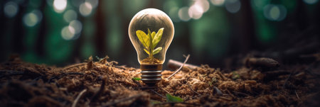 A light bulb with a green plant inside illuminates brightly against a backdrop of lush foliage, symbolizing the promise of clean and renewable energy.