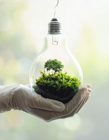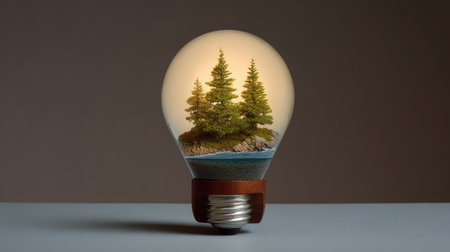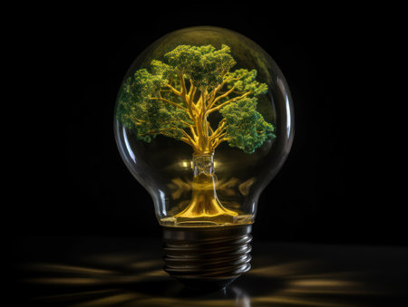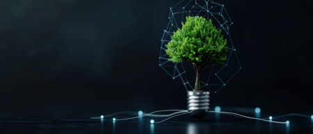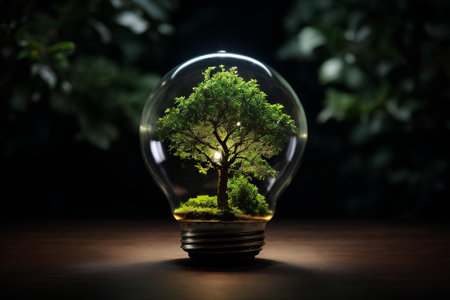 A creative representation of sustainable energy featuring a tree growing inside a light bulb, symbolizing eco-friendly technology and green energy solutions.