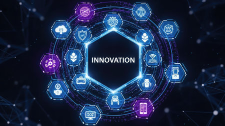 An illustration features a central hexagon with the word INNOVATION, surrounded by numerous technology-related icons. Rendered in a digital style, the composition utilizes various shades of blue and purple. The overall design emphasizes a modern, interconnected network, suitable for commercial projects or editorial content related to technology.