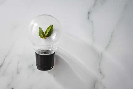 ideas for sustainability and the environment, lightbulb with perfect green V-shaped leaves growing inside of it