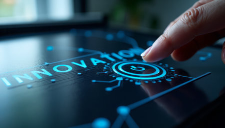 A close-up image captures a hand poised to touch a glowing blue button labeled INNOVATION on a sleek digital interface. The intricate circuitry design surrounding the button adds a futuristic vibe, symbolizing the exciting intersection of technology and creativity.