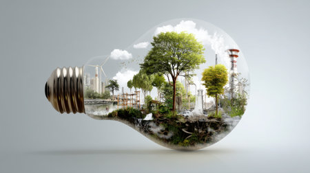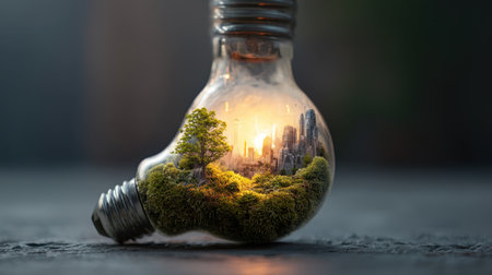 A creative light bulb features a stunning miniature landscape of greenery and a cityscape inside, symbolizing the harmony between nature and urban life.