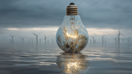 A captivating light bulb contains a miniature coastal landscape with wind turbines and lush greenery, reflecting themes of nature and sustainability.
