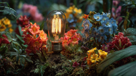A vintage light bulb emits a warm glow amidst a vibrant collection of colorful flowers, creating a harmonious and enchanting garden scene. Ideal for nature themes.