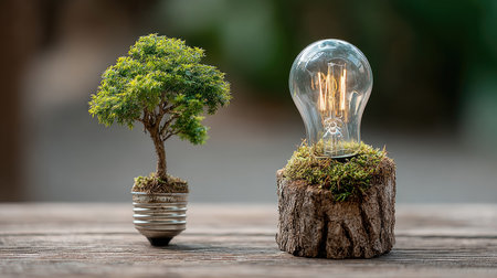 This imaginative composition showcases a small tree next to a glowing light bulb, symbolizing the balance between nature and technology, inspiring eco-conscious innovation.