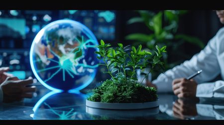 This image showcases the synergy between technology and nature, featuring lush plants atop moss in a modern office. The globe displays data trends, emphasizing sustainability.