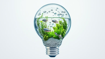 A captivating light bulb filled with vibrant green leaves and clear water, emitting a soft glow against a nighttime backdrop. Perfect for eco-friendly decor themes.