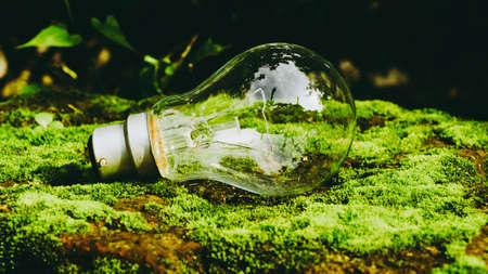 A fluorescent light bulb in sunlight on green nature background. Green business, economy, eco-industries start up ideas innovation background . Go Green to minimize human impact on environment concept