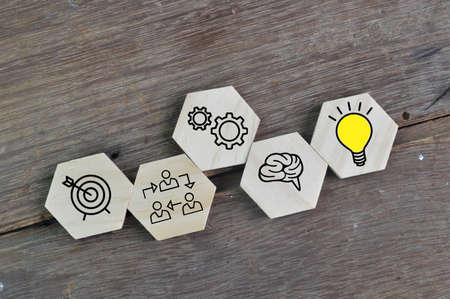 Wooden cube blocks with target, teamwork, cooperation and new idea symbols
