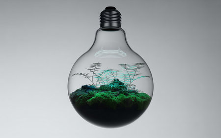 Light bulb filled with a miniature ecosystem of trees and water, visualizing nature-inspired ideas to save the world with space