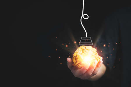 Education concept image. Creative idea and innovation. Crumpled paper as light bulb metaphor over black background