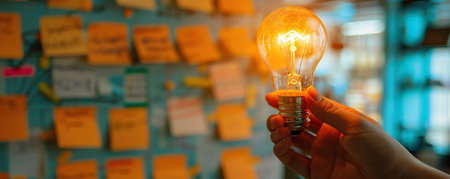 hand holding glowing light bulb. sticky note at brainstorming board at background.