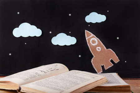 Back to school background. Stack of books and rocket from pencil