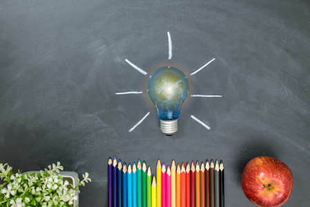 Lamp light with chalk board, color pencils and red apple, conceptual education, ideas