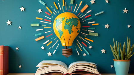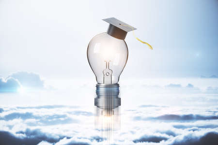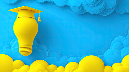 Vibrant graphic design featuring a yellow lightbulb with a graduation cap, set against a backdrop of stylized blue clouds. The colors are bright and cheerful, evoking themes of education, innovation, and achievement. The graphic style is modern and engaging.