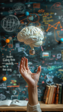 An open book with two light bulbs on the pages. The book is filled with equations and diagrams, giving the impression of a scientific or mathematical text. Scene is one of curiosity and exploration