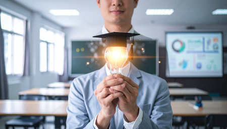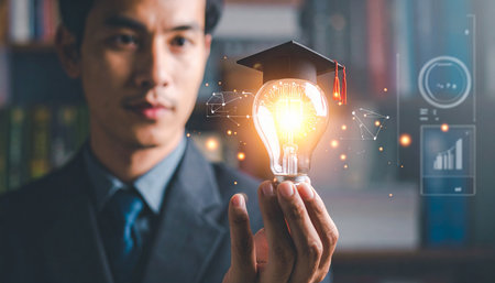 Businessman holding light bulb with lightbulb and graduation cap for education and business concept.
